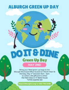 Pick up your Green Up Day trash bags at the Alburgh Municipal Office or the Alburgh Transfer Station and get out in your community on Saturday, May 2 for Green Up Day to clean up your neighborhood roads and waterways. It makes a huge difference and it feels great to give back to your community.